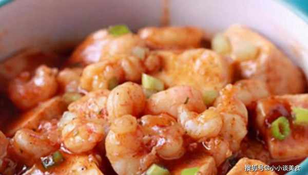 4、倒入調好的麻婆豆腐醬,加入豆腐塊,大火煮2-3分鐘。用文火慢燉約5-6分鐘。湯變濃稠後,加入炸好的蝦,就完成瞭。