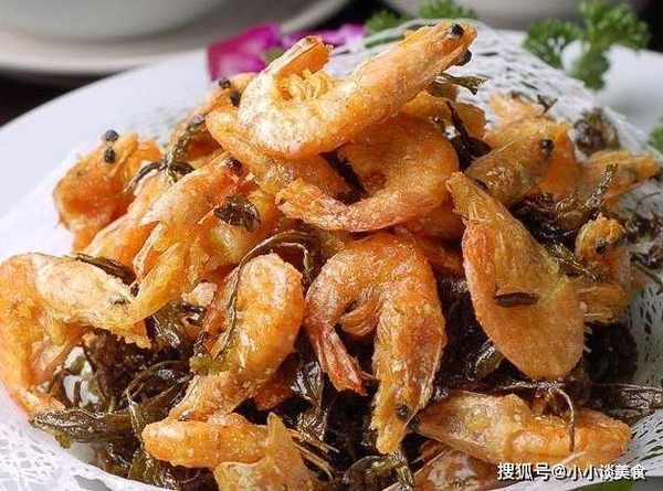 4、將茶葉瀝幹,將茶葉放入幹燥容器中,用小火炒水,然後倒入蝦仁炒至熟,加少許鹽調味,關火。