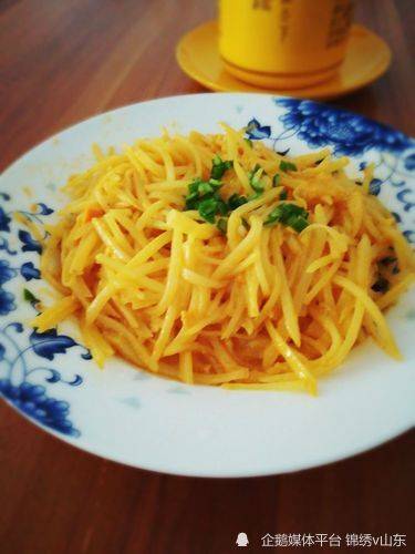 4、將焯過水的土豆絲倒入鍋中,如果口味重的話,可以稍微加一些鹽,翻炒均勻後即可出鍋裝盤。香噴噴的咸蛋黃炒土豆絲就做好瞭。