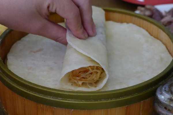 東北春餅,其實跟我們山東人常見的卷餅類似,但個頭要小得多,可以參照小木屋鹵肉大餅,有點兒北京烤鴨餅子的感覺。這款春餅,什麼都可以往裡頭卷,就看自己的喜歡,但一定要卷炒雞蛋的菜肴進去,然後給點大蔥,抹點醬。