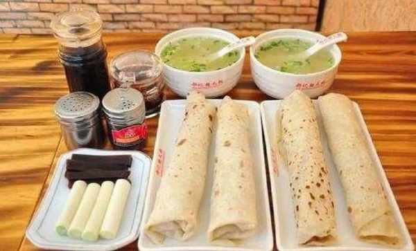 眾所周知,因為武鋼的建設,青山多東北移民的後代。這源於遼寧海城的東北春餅,故而可以在青山區占據一席之地。像我們今天吃的春餅,其實必須還要有醬肘子,跟韭菜炒蛋、豆芽搭配,但那一日醬肘子好像沒瞭。飲品呢,一般就是喝白粥,店內還有大窯汽水,這是新近流行的一款飲料。