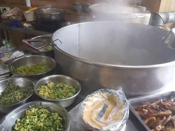 現在大集很少有朝天鍋瞭,但賣豬頭肉等葷食的流動小攤還是有的。今年春節回傢,我和弟弟、弟媳、小侄女幾人就在市區吃瞭傢朝天鍋。店門很小,狹長型,擺個五六張桌椅,餅是單獨烙好的,卷葷菜就是大腸、豬頭肉等,也可以卷炒菜,如土豆絲、青椒炒蛋等等。老板娘特別推薦他傢的油淋茄子。