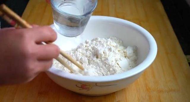 2.準備240毫升溫開水,一邊倒一邊用筷子攪拌成絮狀。