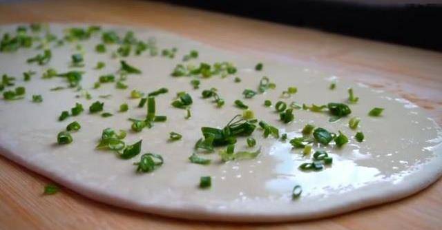 6.將香蔥洗凈後切蔥花,均勻地灑在面片上。