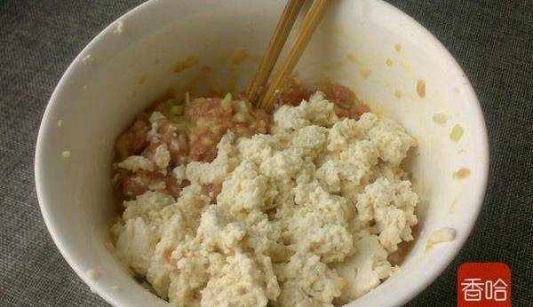 3.把豆腐放肉餡碗裡攪拌均勻