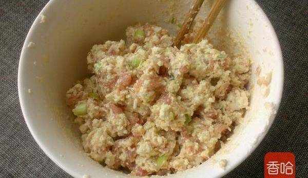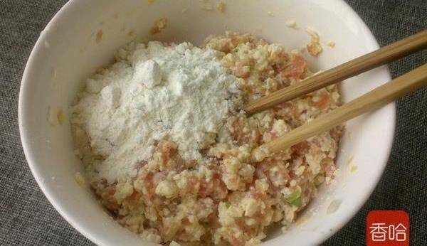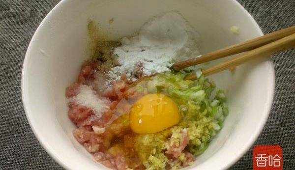 1.豬肉餡放打碗裡,打入雞蛋,放鹽胡椒粉,淀粉,蔥薑末,順一個方向攪拌均勻