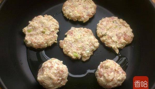 6.平底鍋到適量油,把豆腐肉餡團成球,依次放鍋裡,再輕輕按壓成小圓餅,中小火煎制