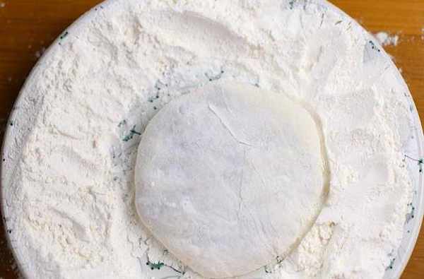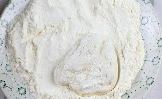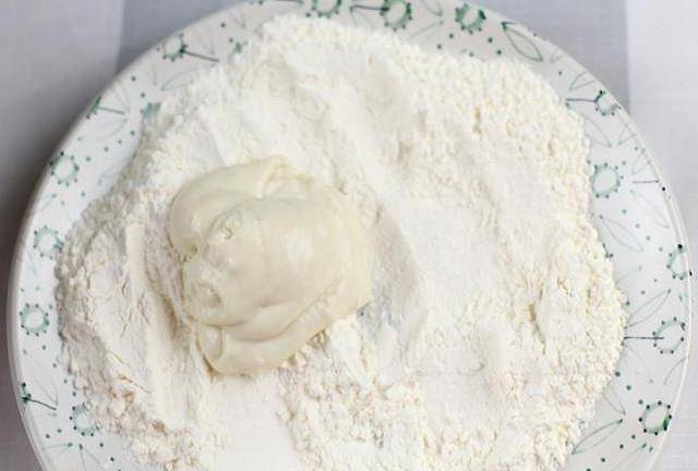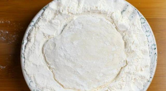 準備一盤面粉,用筷子挑起一小塊面,放入面粉盤當中。