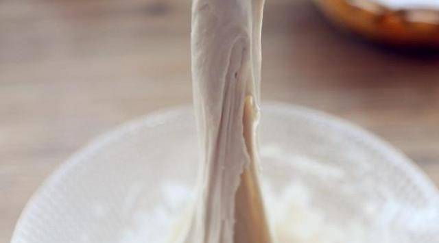 餅坯制作:(1)餳面很關鍵,用筷子把面糊挑起,挑很長面都不會斷,面就餳好瞭,如圖。
