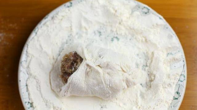 放入肉餡,拉起面皮對角捏住將肉餡包裹起來。