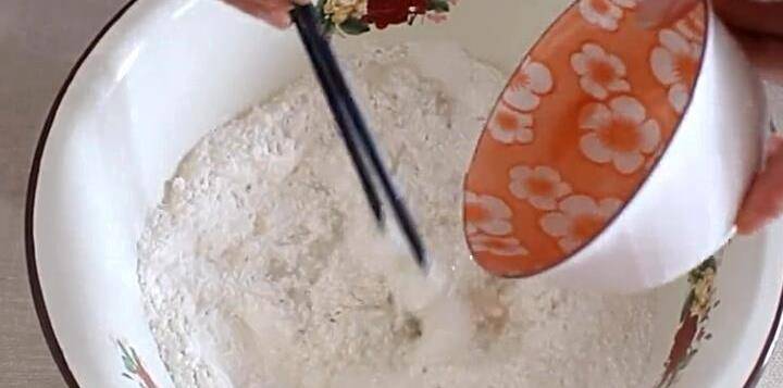 1、盆中準備300克面粉,加入2克鹽,倒入150克溫水,邊倒邊攪拌。