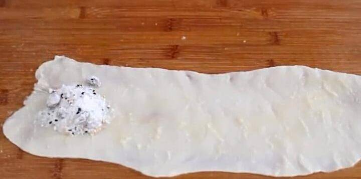 6、把面劑抻長,按扁,盡量按壓得薄一些,均勻得抹上一層油酥,在一端放上糖餡。