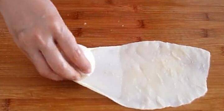 7、左右手交叉拉住面皮,把糖餡包起來,邊拉邊卷,拇指和食指把邊緣的面皮往裡壓,收尾處越薄越好。