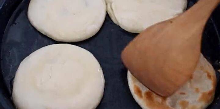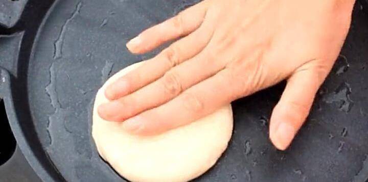 8、電餅鐺裡刷一層油,開小火,把做好的餅胚下鍋,用手輕輕按扁,壓薄。
