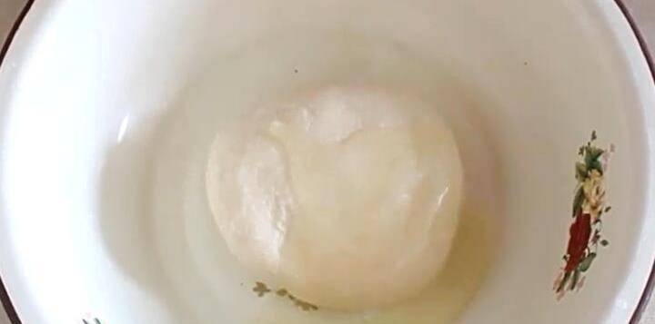2、攪拌至面粉呈絮狀,倒入40克食用油,揉成光滑的面團,在面團表面再抹一層油,蓋上蓋子,醒面40分鐘。