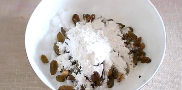 4、小碗中準備半碗白糖,加入適量的花生碎、黑芝麻、葡萄幹、面粉,攪拌均勻,做成糖餡。