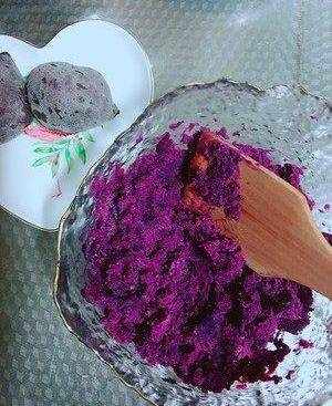1、將紫薯蒸熟冷卻,去皮,壓碎!和面粉加酵母粉再將冷卻的紫薯加入和面粉一起攪拌,揉捏成團。發酵25分鐘。