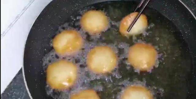 沿著鍋邊放入小餅,開中火慢炸,炸至一面定型,翻個面繼續炸,使兩面都受熱均勻,慢慢的餅就像氣球一樣鼓起來瞭,再炸60秒,炸至表面金黃,像這樣就可以控油出鍋瞭。我們美味的糖糕就做好瞭,現在吃上一口特別的美味,大人孩子都非常的喜歡。