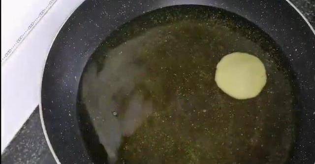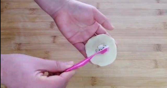 面稍微放涼以後取出來,輕輕揉幾下,揉至表面光滑,像這樣就可以再把它搓成細長條,分割成大小均勻的小劑子,取一個小劑子捏成邊緣薄中間厚的餅皮,放入一勺糖餡,像咱們平常包子一樣包起來,收口處捏緊,防止漏餡,再稍微整理一下,輕輕拍扁,拍成一個小圓餅,像這樣就可以全部做完以後我們起鍋燒油。