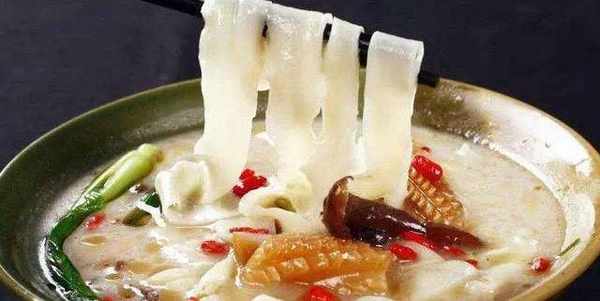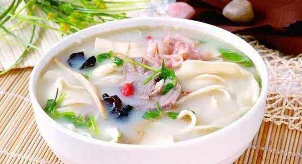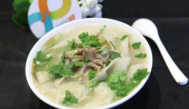 第五步:另起一鍋,將之前燉好的羊肉湯倒入一些,加入適量的食鹽和胡椒粉調味。再把之前做好的燴面拉開,下入湯裡煮上3分鐘左右,再放入青菜,最後把剔好的羊肉和蝦仁一起放入,煮開即可。