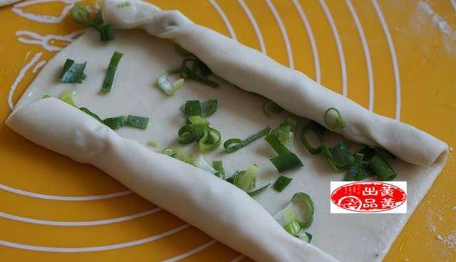 9、撒上一層蔥花後,分兩面朝裡卷起。