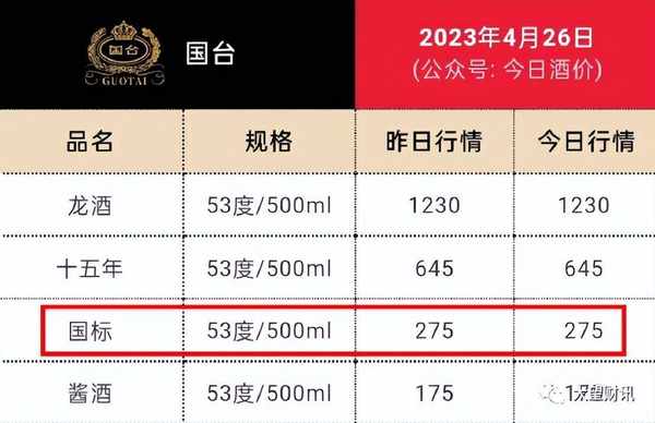 在國臺酒業官網,國臺國標酒500ml的零售價為699元/瓶。大望財訊通過查詢今日酒價發現,4月26日,國臺國標酒的今日行情僅為275元。