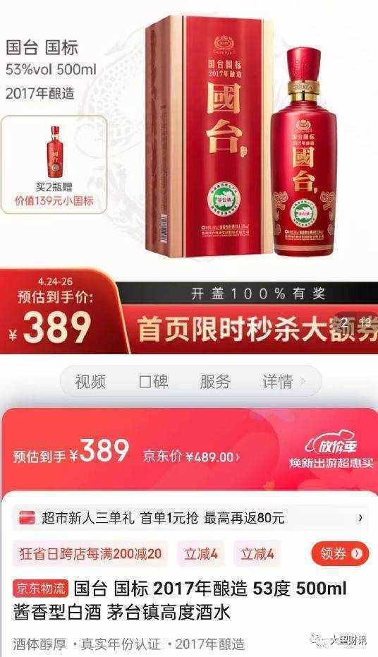 京東國臺官方旗艦店顯示,國臺國標酒的售價為389元每瓶。對此,大望財訊咨詢旗艦店客服,詢問國臺國標酒的官網零售價與旗艦店實際價格有所差距的原因是什麼,客服稱:“店鋪不同,促銷不同的,店鋪是官方授權,酒廠直供的,可以保證正品的。”並承諾“假一罰三”。