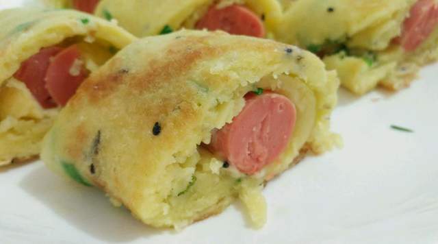 (2) 把煎蛋餅放在盤子裡,把芝士片鋪在煎蛋餅上,再放上煎好的香腸和酸黃瓜。
