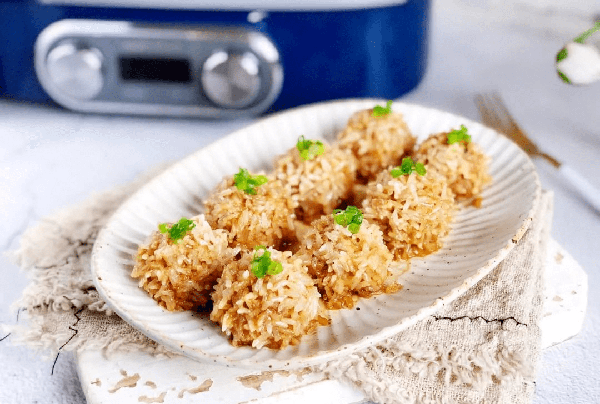 食材:糯米、豬肉餡各100克,蔥末、薑末各15克、料酒15克,香油10克,五香粉、鹽、雞精、淀粉各適量。