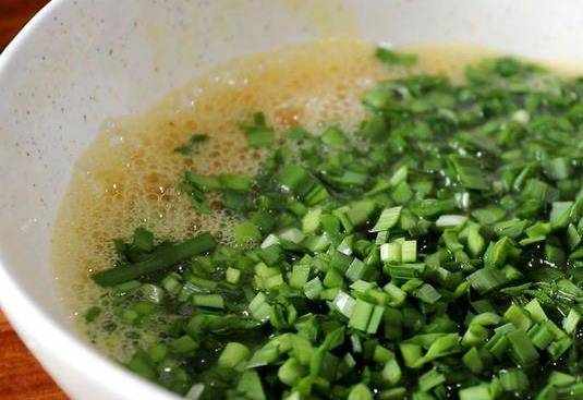 在蛋液中加入韭菜末,攪拌均勻。