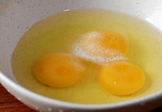 將3個雞蛋打在碗中,加入少量雞精和1/2茶匙鹽,攪拌均勻,使雞蛋打散。