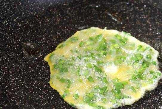 鍋裡倒油,放入一大勺蛋液,煎成圓形。