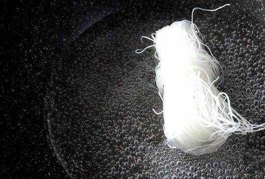 將龍口粉絲放入沸騰的水中,煮至其變軟,然後用刀切開。(長度2 ~ 3厘米就足夠瞭。)不需要太長。