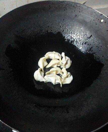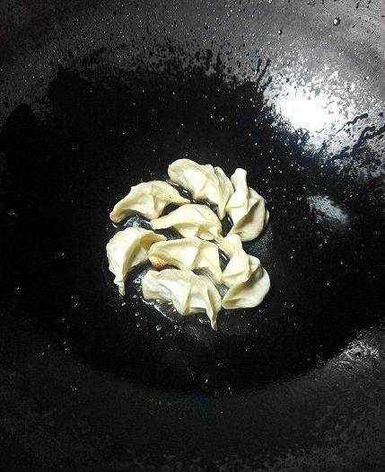 鍋裡放適量食用油,餃子無需解凍,下鍋排好,中小火煎。用平底鍋最好,方便;隻是我傢平底鍋太大,我吃不瞭那麼多餃子,幾個餃子勾上一鍋的淀粉水,著實不方便,所以用的鐵鍋。