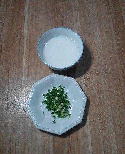 先把小蔥去根洗凈切蔥花;淀粉與水按1:10的比例調成水淀粉,具體要看你做瞭多少餃子,我煎瞭8個,用瞭半碗(飯碗)水淀粉。