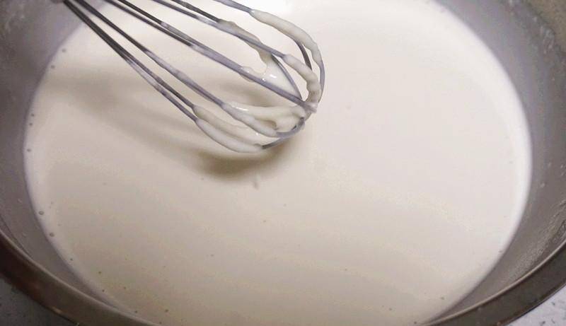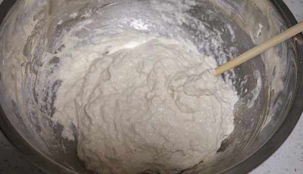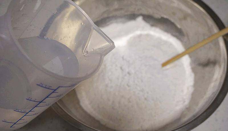 3、剩餘的250克水繼續倒入,筷子順著一個方向不斷攪拌面糊,攪拌到面糊變得順滑,沒有面疙瘩,這個過程大概要10分鐘左右。