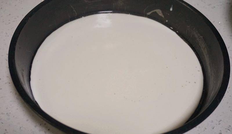 4、找一個圓盤,刷上薄薄一層食用油,舀一勺面漿,倒入盤中,稍微晃動一下,使得整個盤子均勻分佈面漿。