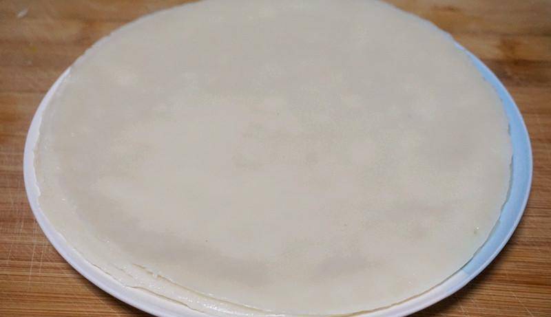 7、薄薄的面皮,很快就能涼透,放在抹瞭一層食用油的盤子上,這樣涼皮就做好瞭。