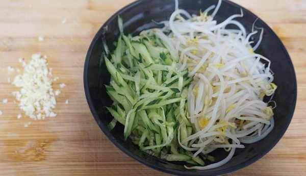 9、適量的豆芽菜洗凈過開水焯,黃瓜洗凈切絲。