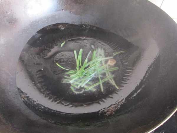 鍋裏放入適量的花生油,改成小火把葱絲和薑絲放入煸炒出香味,再改成大火。