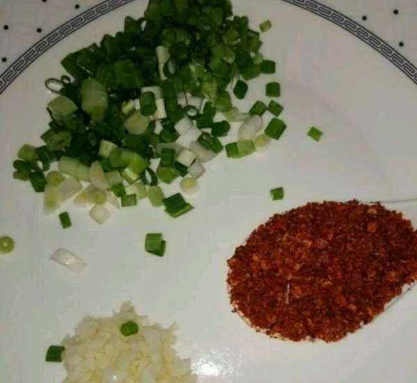 2、準備蔥花、辣椒面、蒜末,蒜末要多點這樣會更加香