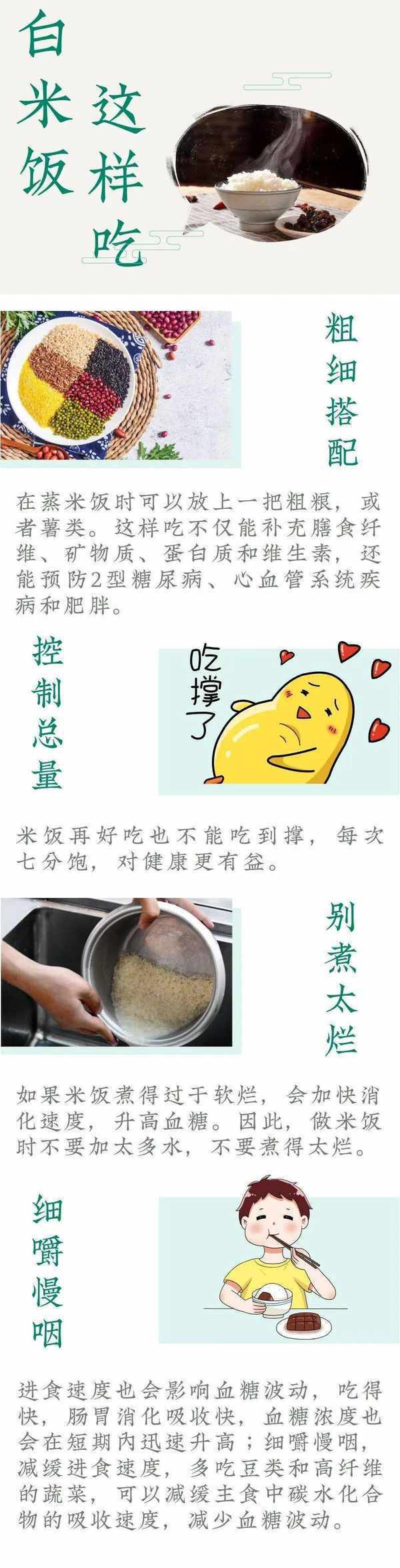 2022年發表的一項薈萃分析發現,每天攝入白米飯300克(煮熟後的重量)可能是一個閾值,在此閾值以上,每攝入158克,患2型糖尿病的風險就增加13%。不過,這一結果並不適用於中國人群,在納入分析的4項中國人群研究中,有3項顯示白米飯攝入量與2型糖尿病沒有關聯。研究者推測可能是由於在中國傳統飲食中,每餐不僅有米飯,還有蔬菜、肉類、海鮮等菜肴,從而減緩瞭血糖上升的幅度。因此,“白米飯會導致國人患上糖尿病”的觀點是不成立的。