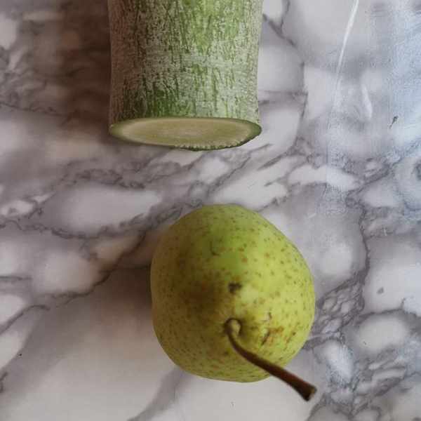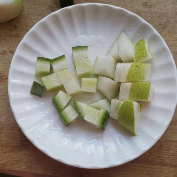 把蘿蔔洗淨切丁,梨子洗淨不用去皮,切成小塊。