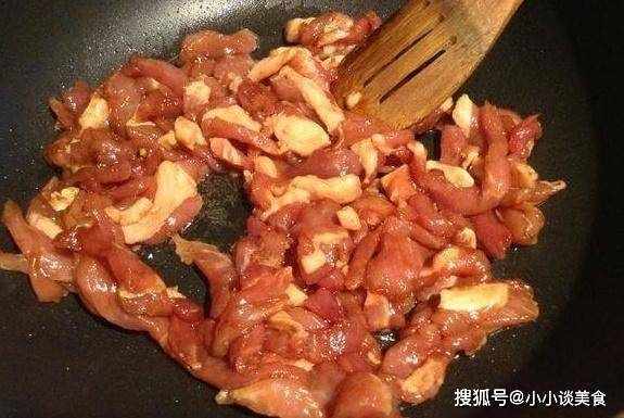 第三步:扁豆洗凈,切成條狀。當所有的材料都處理好後,就可以開始燒鍋瞭。用大火加熱平底鍋,倒入少量油。當油80%熱時,將豬肉放入其中。快速將豬肉和豬肉翻炒均勻。炒至變色,撈出放入碗中待用,然後用剩餘的油將胡蘿卜翻炒,將胡蘿卜炒軟,加入扁豆末。