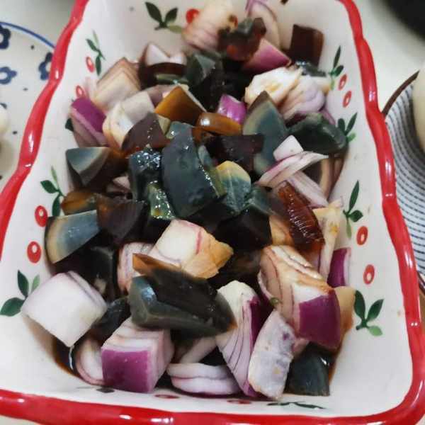 洋葱皮蛋是屬於凉拌菜,很受家人的歡迎,很多人說洋葱味道太沖,其實吃完了漱口嚼一片茶葉即可解决氣味的問題。吃洋葱好處多多不要因為氣味兒放弃它。