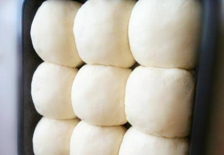 第四步,將發酵成功的面團整理成長條,然後分成21等份的面團。搟成球後,蓋上保鮮膜靜置10分鐘。搟成圓餅,放入餡料。揉勻,依次放入模具中;