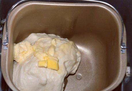 第二步開始面包機的揉面過程,揉到比較有韌性的階段,把黃油放進去繼續揉面團,最後揉好的面團應該是可以拉膜的狀態出去;