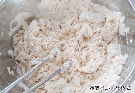 制作過程:第一步先把面粉放在一個大碗裡,加少許酵母粉和少許鹽,一點點倒入熱水,用筷子攪拌成絮狀,然後揉成一團用手揉面團;