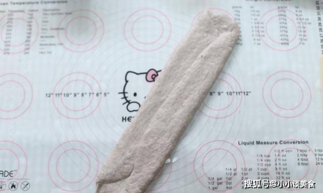 6、然後翻過來,把左右長邊從中間對折用手壓扁,再用搟面杖搟長一點,厚度就一樣瞭。