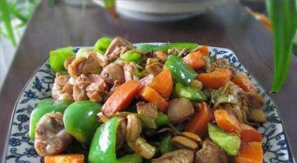 4、炒鍋加入少量植物油。油熱後倒入切好的辣椒和煮好的胡蘿卜,加入適量的鹽和生抽翻炒片刻。然後倒入炸好的雞塊,翻炒片刻即可出鍋。
